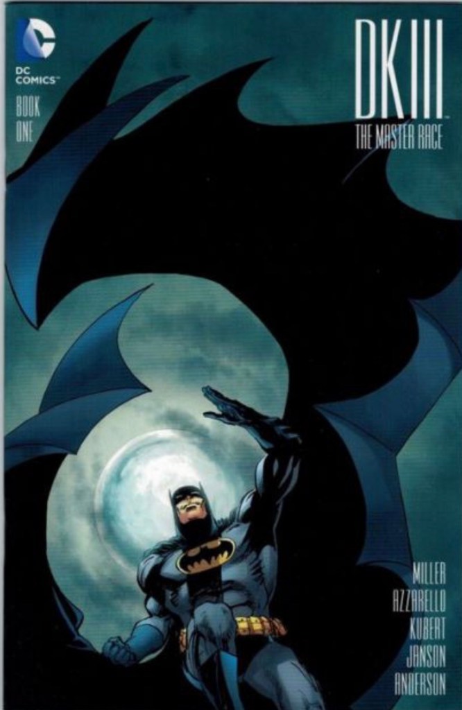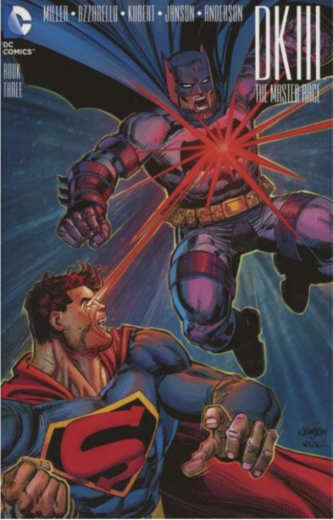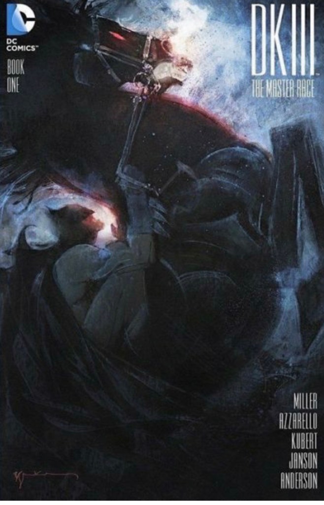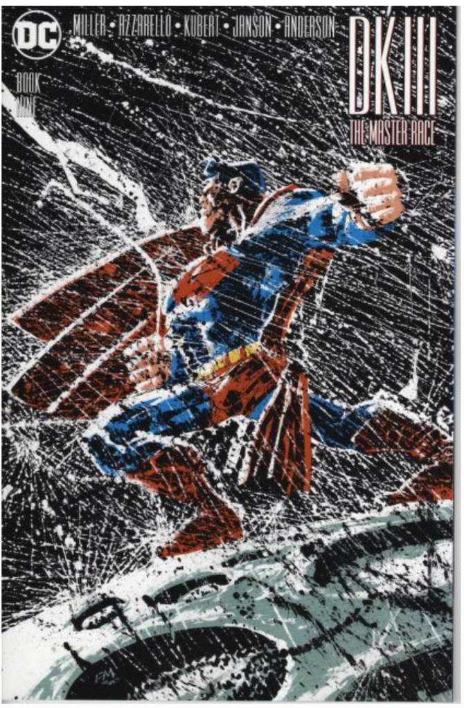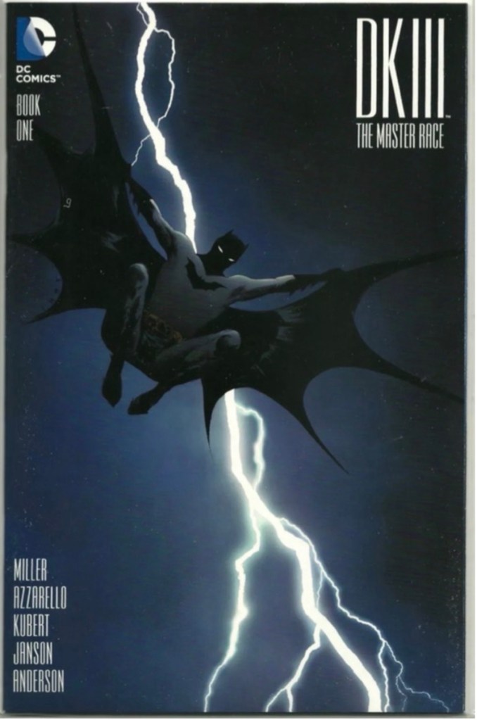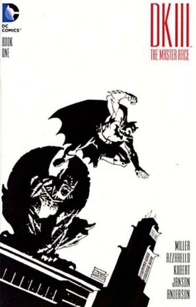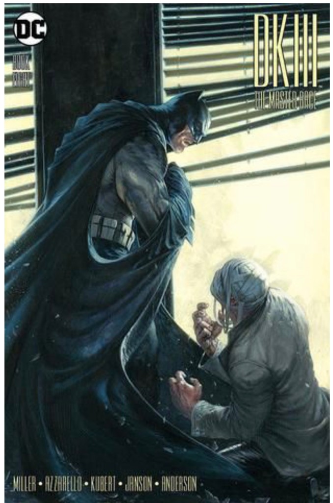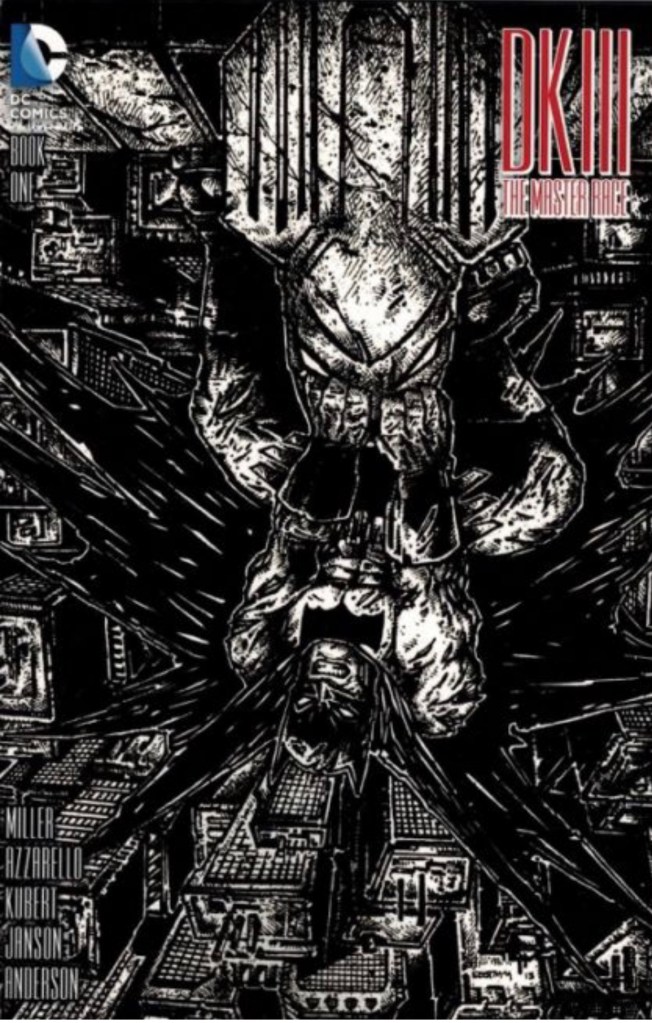 The Dark Knight III: The Master Race (aka DK3) is a 2015-2017 nine issue miniseries co written by Frank Miller & Brian Azzarello and illustrated by Miller, Klaus Janson and Andy Kubert. Additionally the creative team included: Brad Anderson, Jim Lee and Scott Williams. Numerous guest artist contributed variant covers for each issue including some limited print variants that were exclusive to specific Comic Book shops. In DKIII, Ray Palmer restores 1,000 of the inhabitants of Kandor to full-size, but they immediately begin to terrorize the Earth. Batman sets out to assemble his former allies against the invaders.