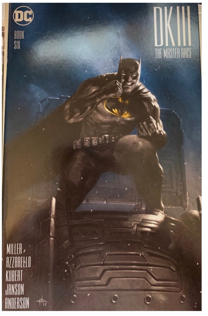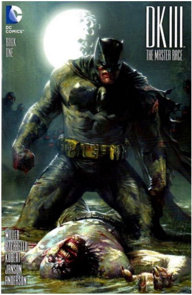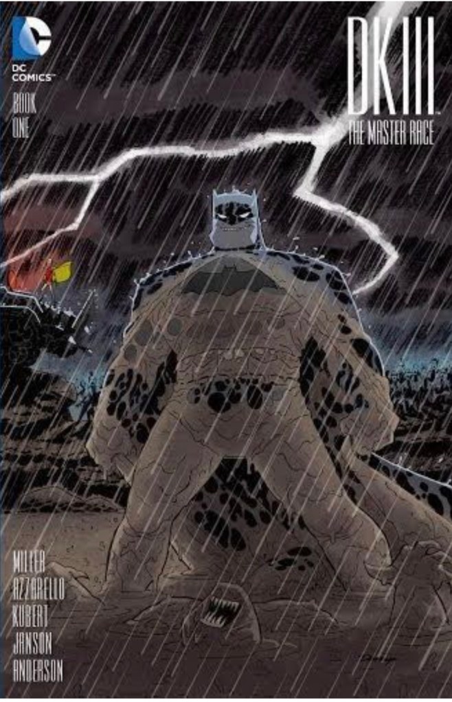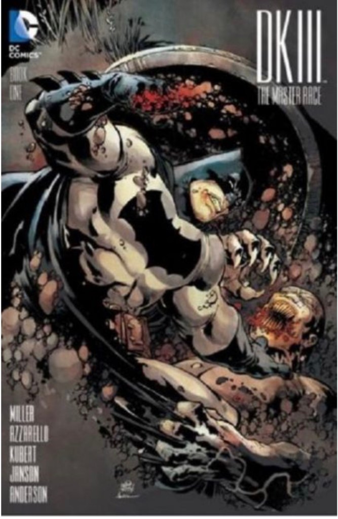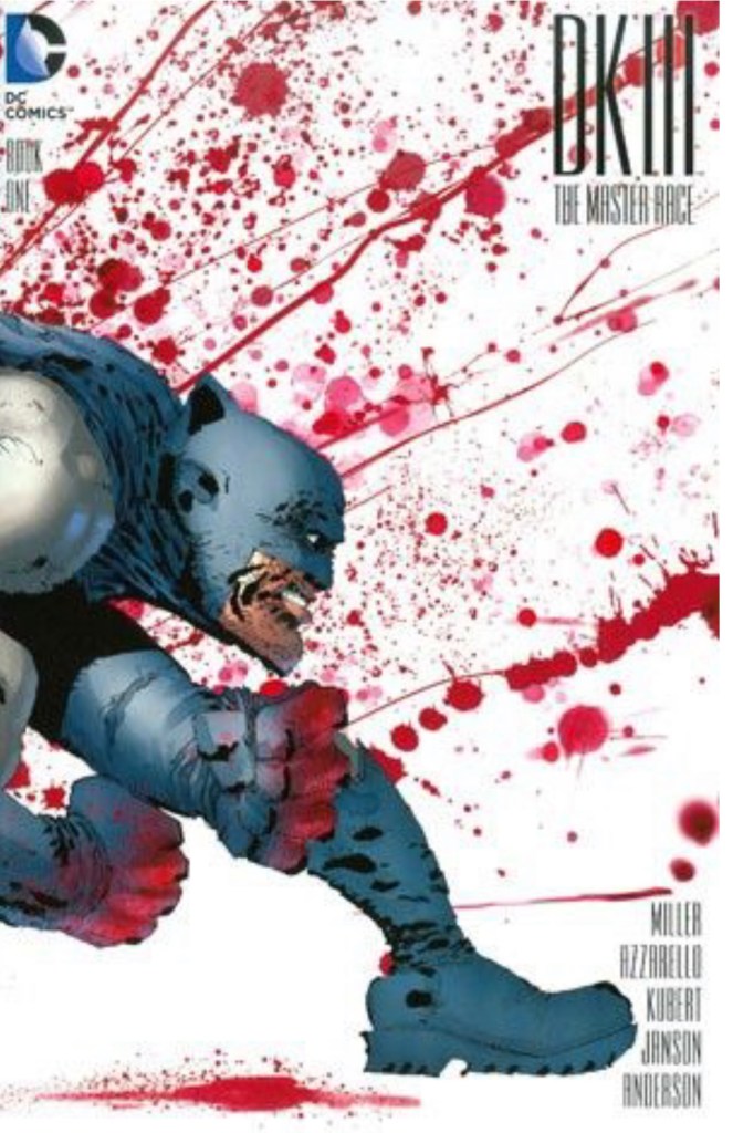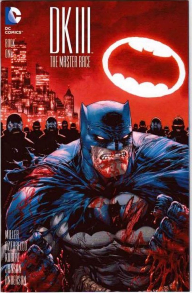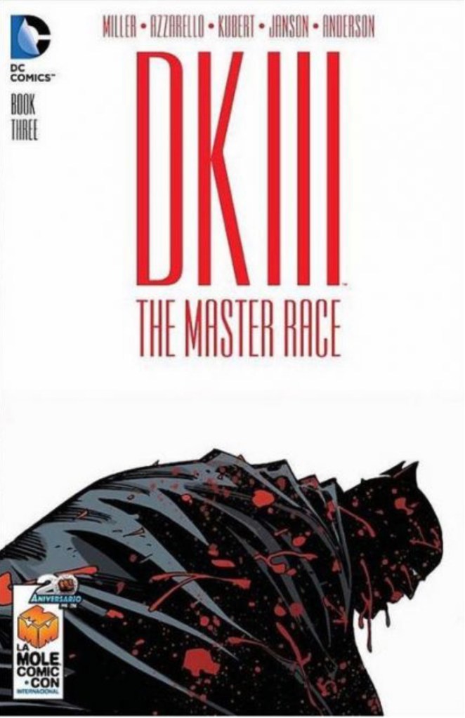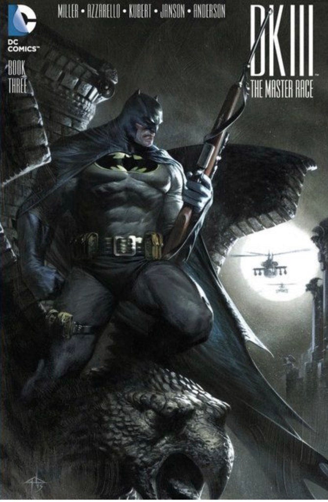 The Dark Knight III: The Master Race (aka DK3) is a 2015-2017 nine issue miniseries co written by Frank Miller & Brian Azzarello and illustrated by Miller, Klaus Janson and Andy Kubert. Additionally the creative team included: Brad Anderson, Jim Lee and Scott Williams. Numerous guest artist contributed variant covers for each issue including some limited print variants that were exclusive to specific Comic Book shops. In DKIII, Ray Palmer restores 1,000 of the inhabitants of Kandor to full-size, but they immediately begin to terrorize the Earth. Batman sets out to assemble his former allies against the invaders.