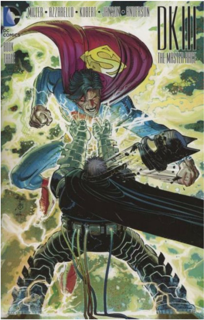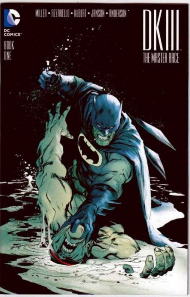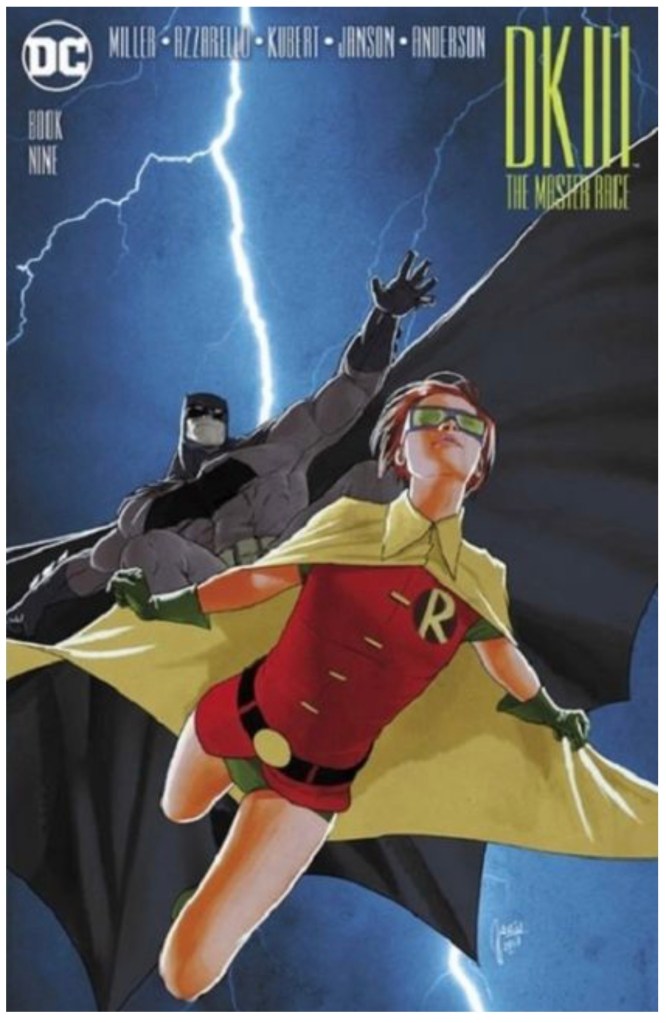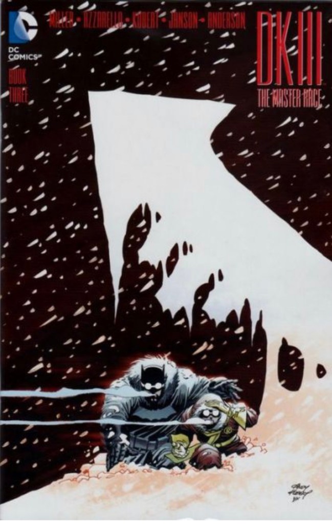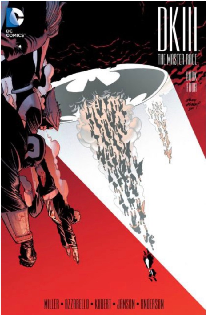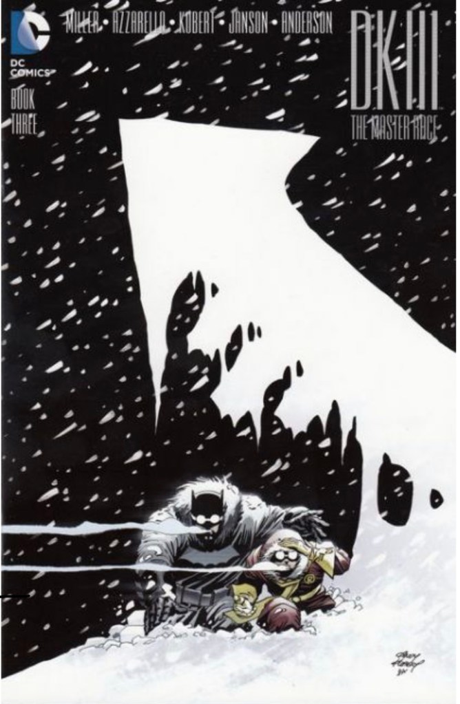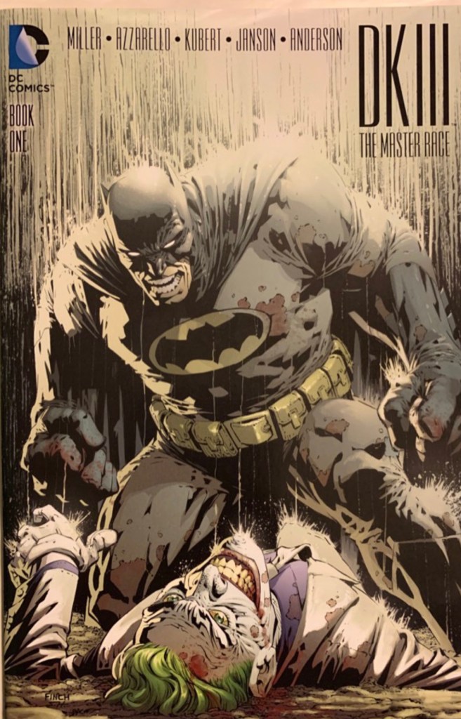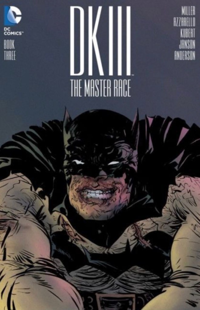 The Dark Knight III: The Master Race (aka DK3) is a 2015-2017 nine issue miniseries co written by Frank Miller & Brian Azzarello and illustrated by Miller, Klaus Janson and Andy Kubert. Additionally the creative team included: Brad Anderson, Jim Lee and Scott Williams. Numerous guest artist contributed variant covers for each issue including some limited print variants that were exclusive to specific Comic Book shops. In DKIII, Ray Palmer restores 1,000 of the inhabitants of Kandor to full-size, but they immediately begin to terrorize the Earth. Batman sets out to assemble his former allies against the invaders.
