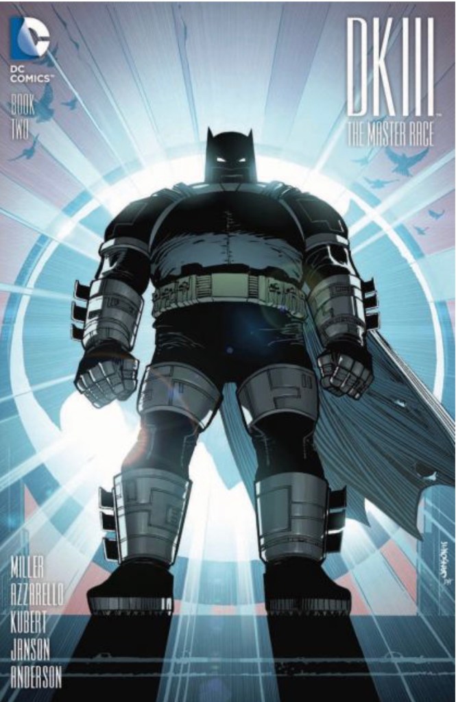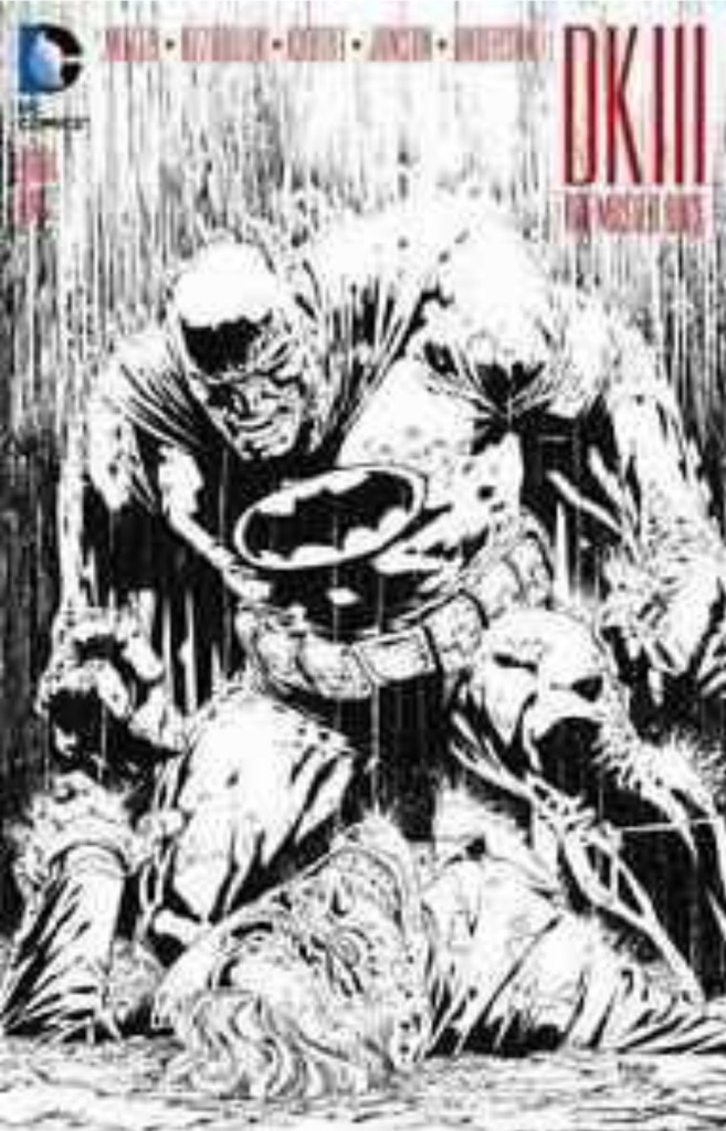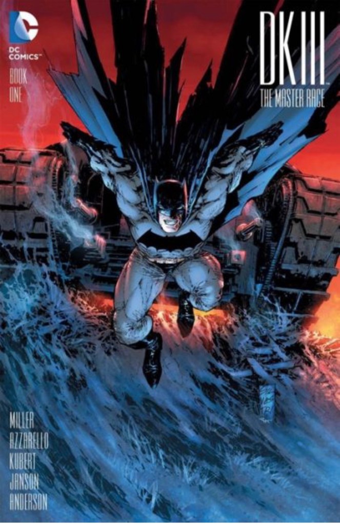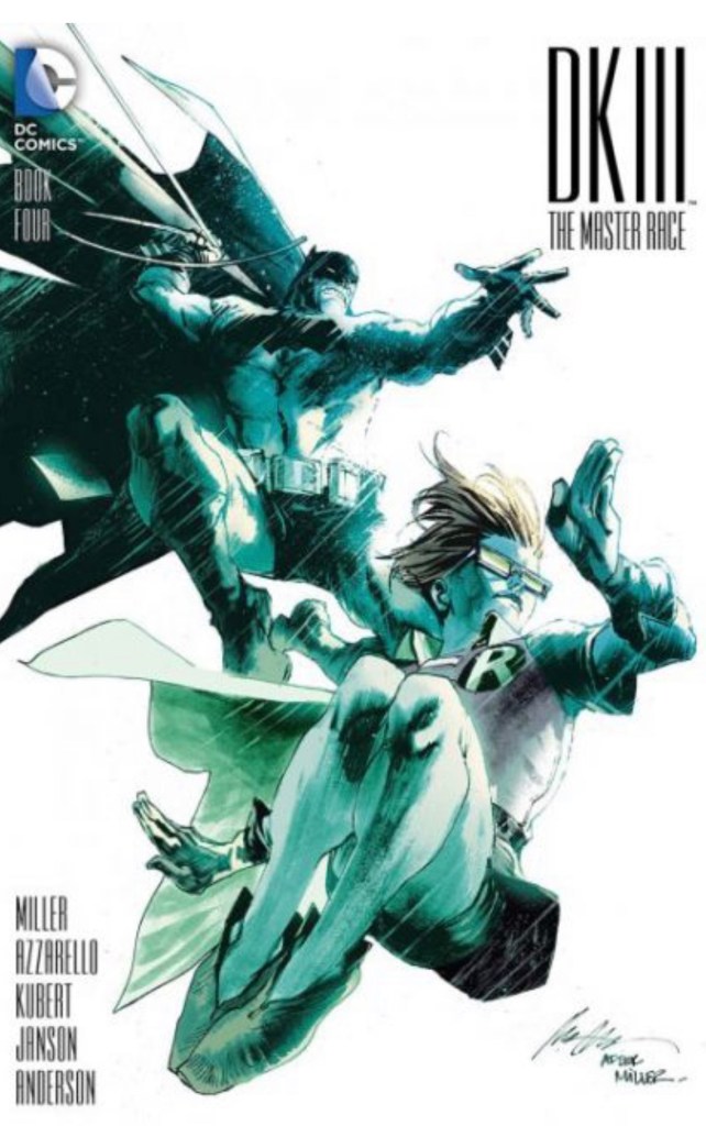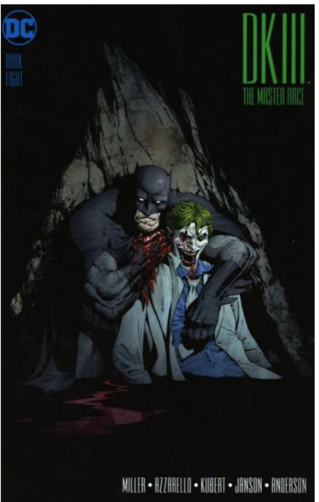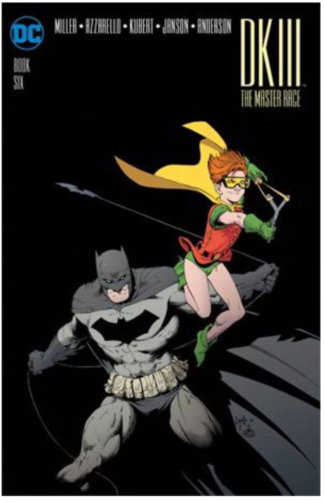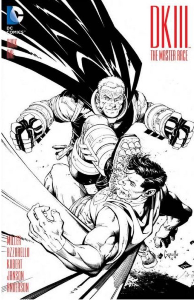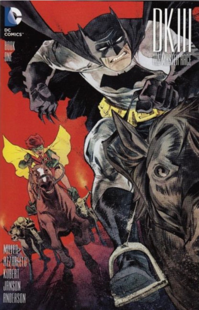 The Dark Knight III: The Master Race (aka DK3) is a 2015-2017 nine issue miniseries co written by Frank Miller & Brian Azzarello and illustrated by Miller, Klaus Janson and Andy Kubert. Additionally the creative team included: Brad Anderson, Jim Lee and Scott Williams. Numerous guest artist contributed variant covers for each issue including some limited print variants that were exclusive to specific Comic Book shops. In DKIII, Ray Palmer restores 1,000 of the inhabitants of Kandor to full-size, but they immediately begin to terrorize the Earth. Batman sets out to assemble his former allies against the invaders.
