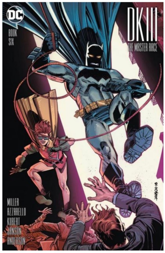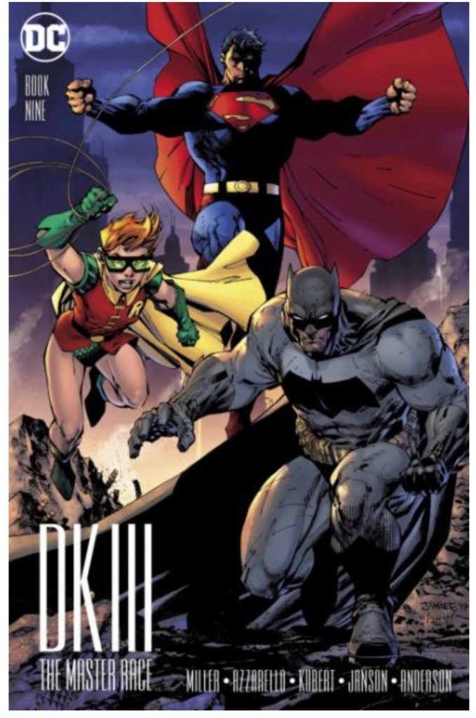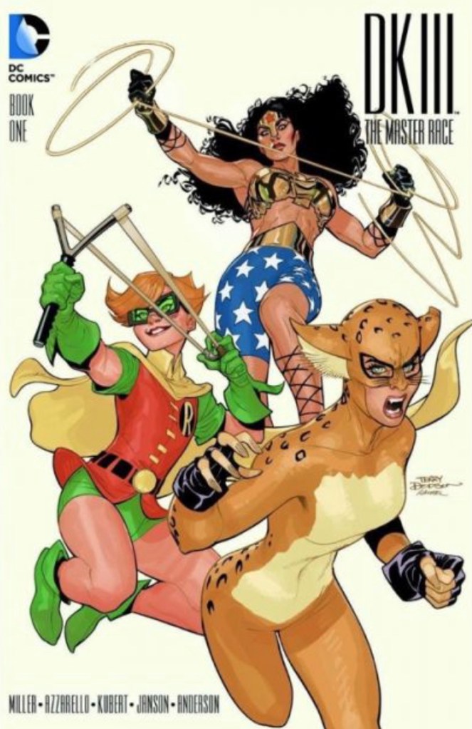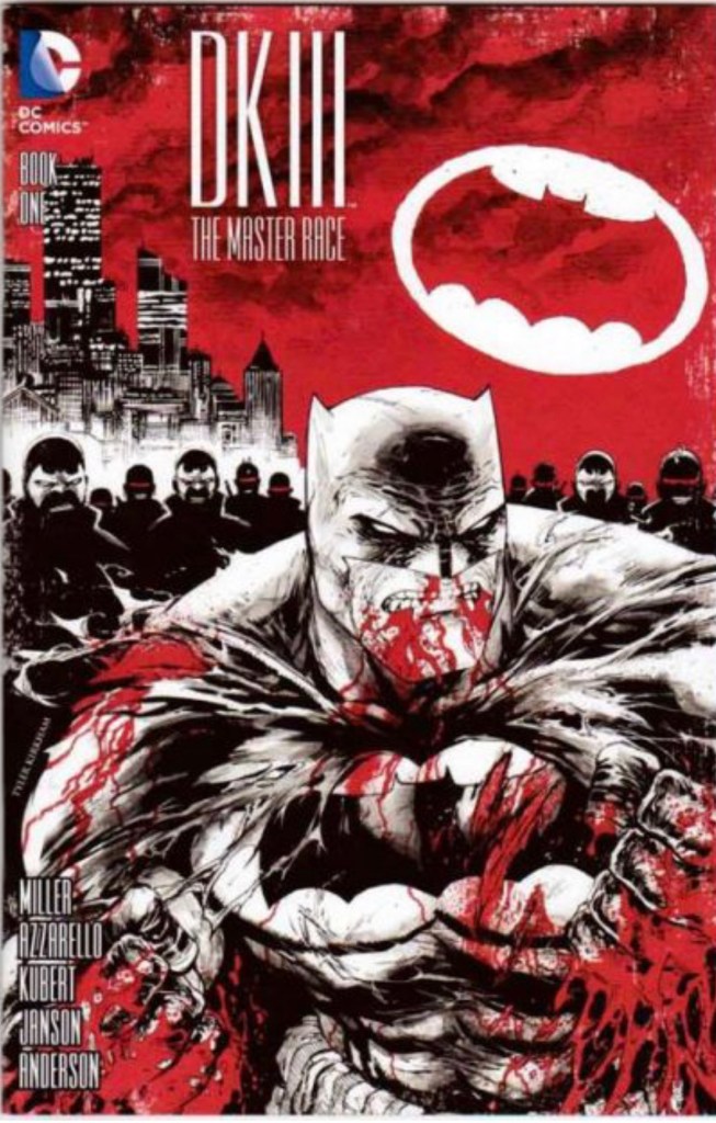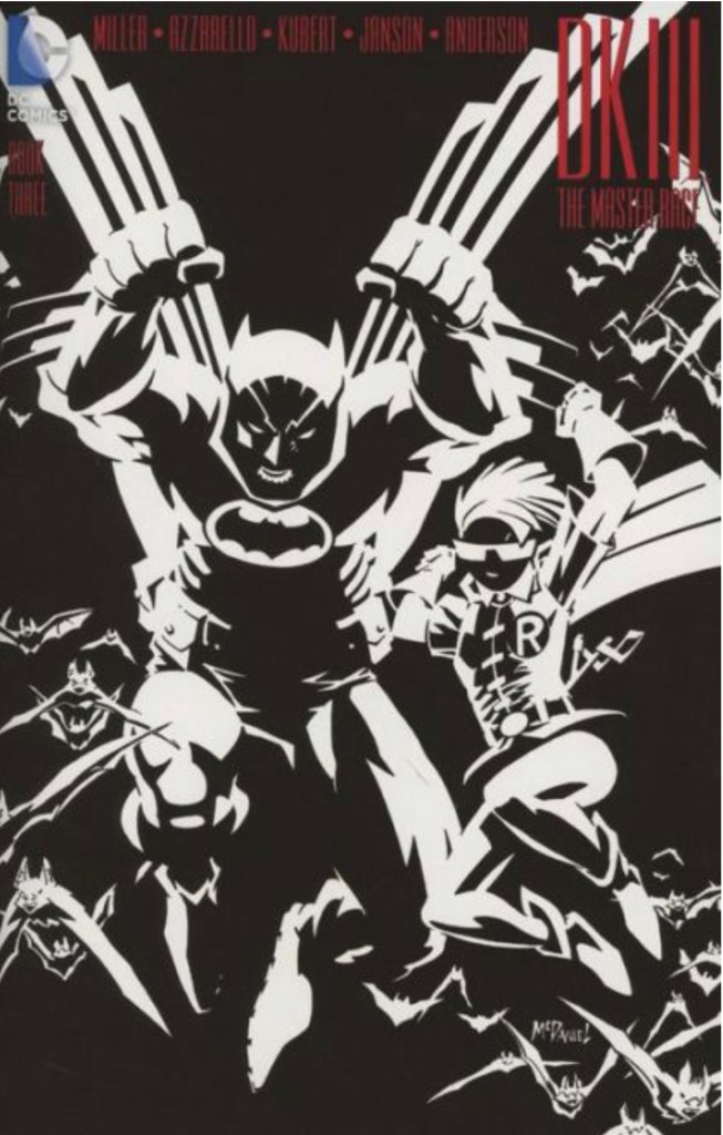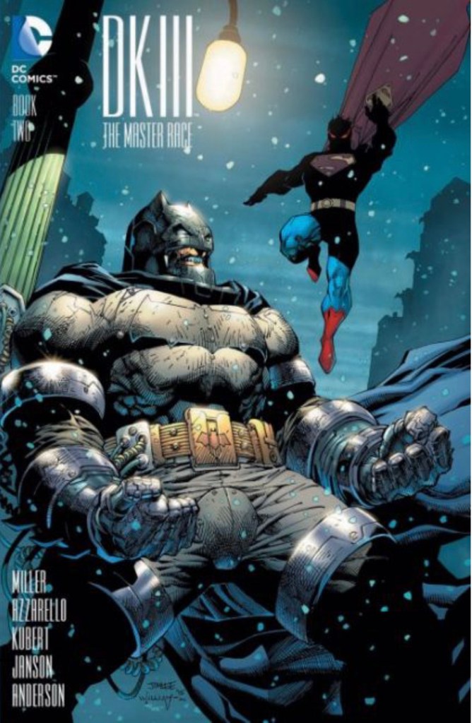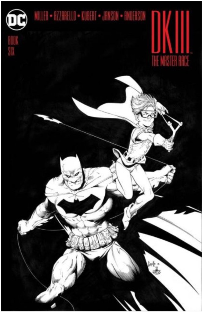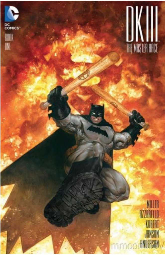 The Dark Knight III: The Master Race (aka DK3) is a 2015-2017 nine issue miniseries co written by Frank Miller & Brian Azzarello and illustrated by Miller, Klaus Janson and Andy Kubert. Additionally the creative team included: Brad Anderson, Jim Lee and Scott Williams. Numerous guest artist contributed variant covers for each issue including some limited print variants that were exclusive to specific Comic Book shops. In DKIII, Ray Palmer restores 1,000 of the inhabitants of Kandor to full-size, but they immediately begin to terrorize the Earth. Batman sets out to assemble his former allies against the invaders.