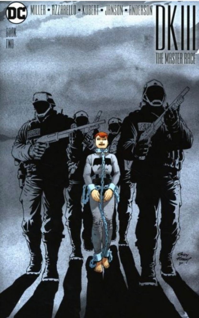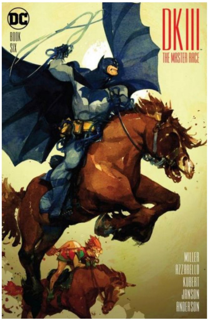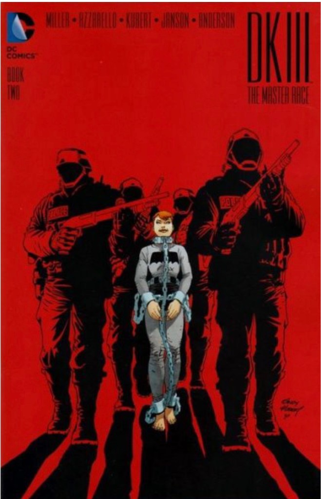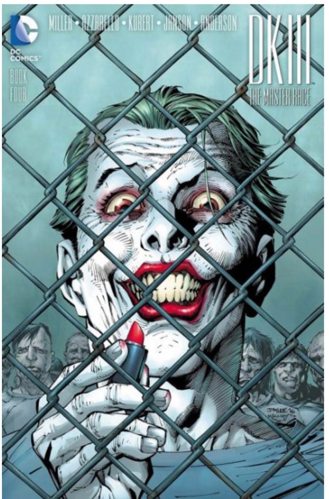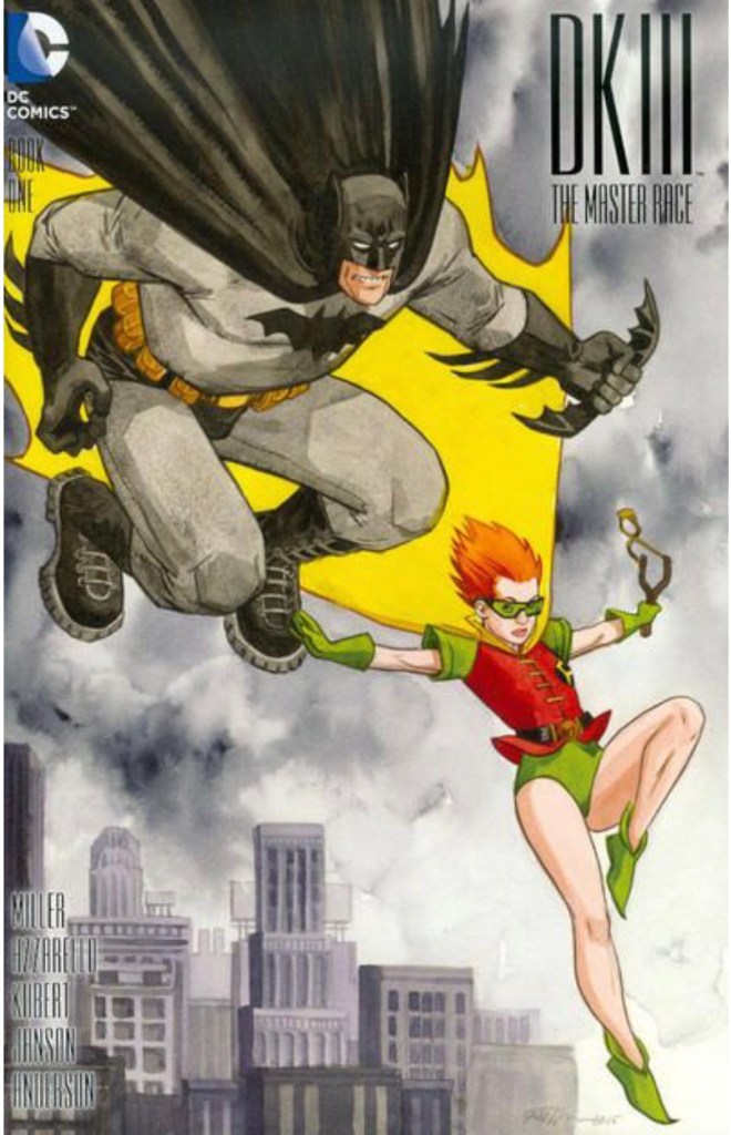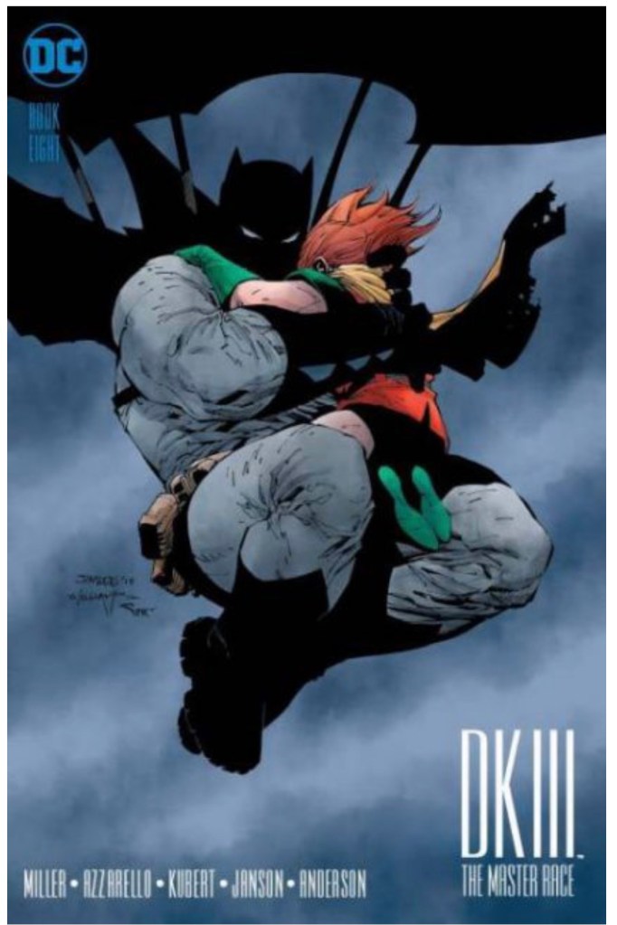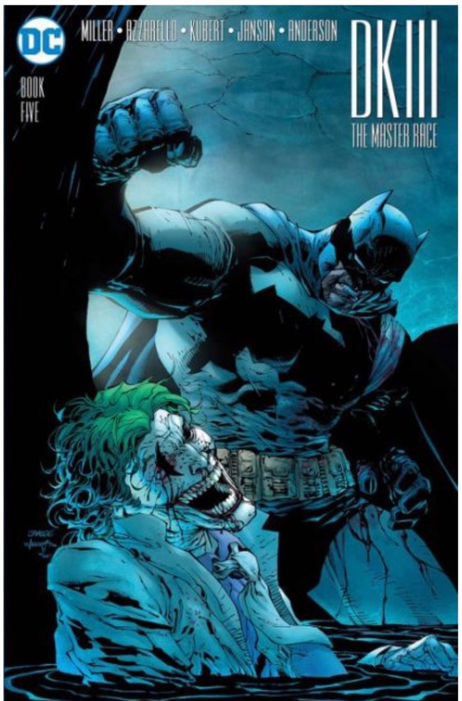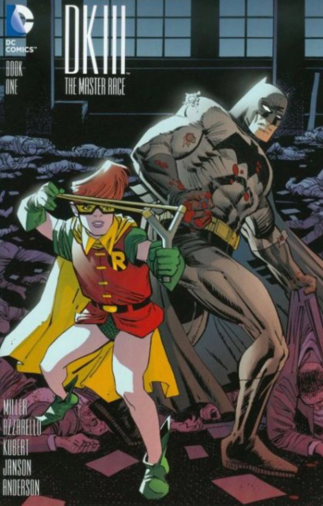 The Dark Knight III: The Master Race (aka DK3) is a 2015-2017 nine issue miniseries co written by Frank Miller & Brian Azzarello and illustrated by Miller, Klaus Janson and Andy Kubert. Additionally the creative team included: Brad Anderson, Jim Lee and Scott Williams. Numerous guest artist contributed variant covers for each issue including some limited print variants that were exclusive to specific Comic Book shops. In DKIII, Ray Palmer restores 1,000 of the inhabitants of Kandor to full-size, but they immediately begin to terrorize the Earth. Batman sets out to assemble his former allies against the invaders.