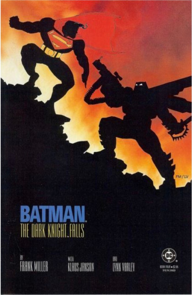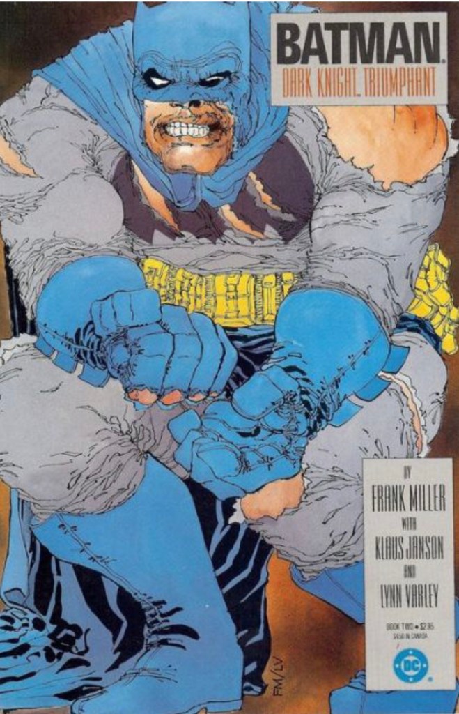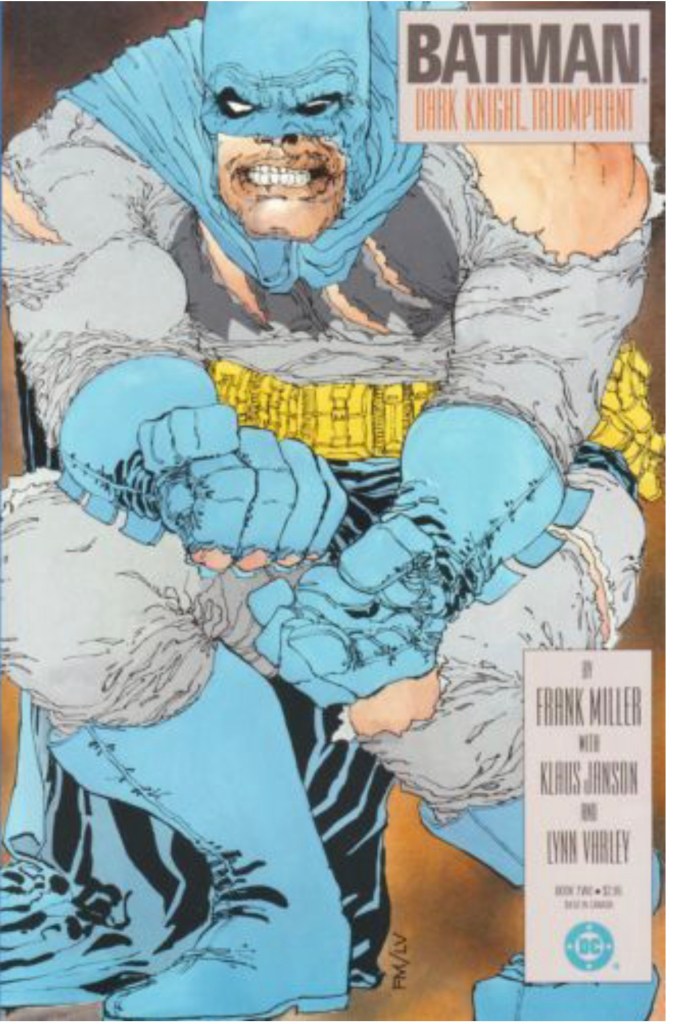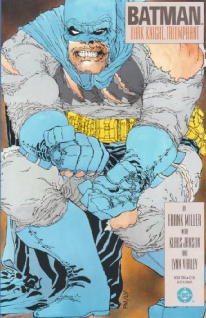 The Dark Knight Returns is a 1986 four issue miniseries written by Frank Miller and illustrated by Miller and Klaus Janson with color by Lynn Varley. DKR is set in a possible future, portrayed as Batman’s last adventure. The story depicts Bruce Wayne as an old man, coming out of retirement to be Batman again. Miller would go on to write a companion story in 1987 titled Year One, showing Batman’s first adventure.