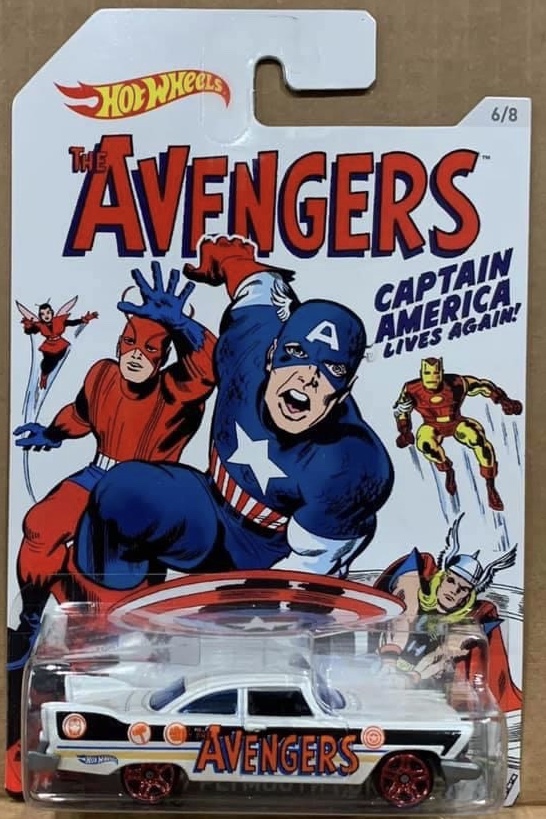 Hot Wheels 1/64th Scale 6/8 ” ’57 Plymouth Fury” (Avengers). Card stock is from the cover of Avengers Vol. 1 #4. Cover Artist Jack Kirby (un-opened)